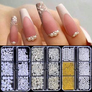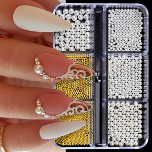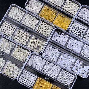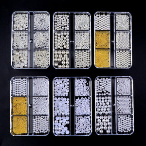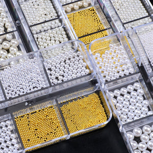 6 Grids 3D Nail Decoration White Pearls & Steel Beads