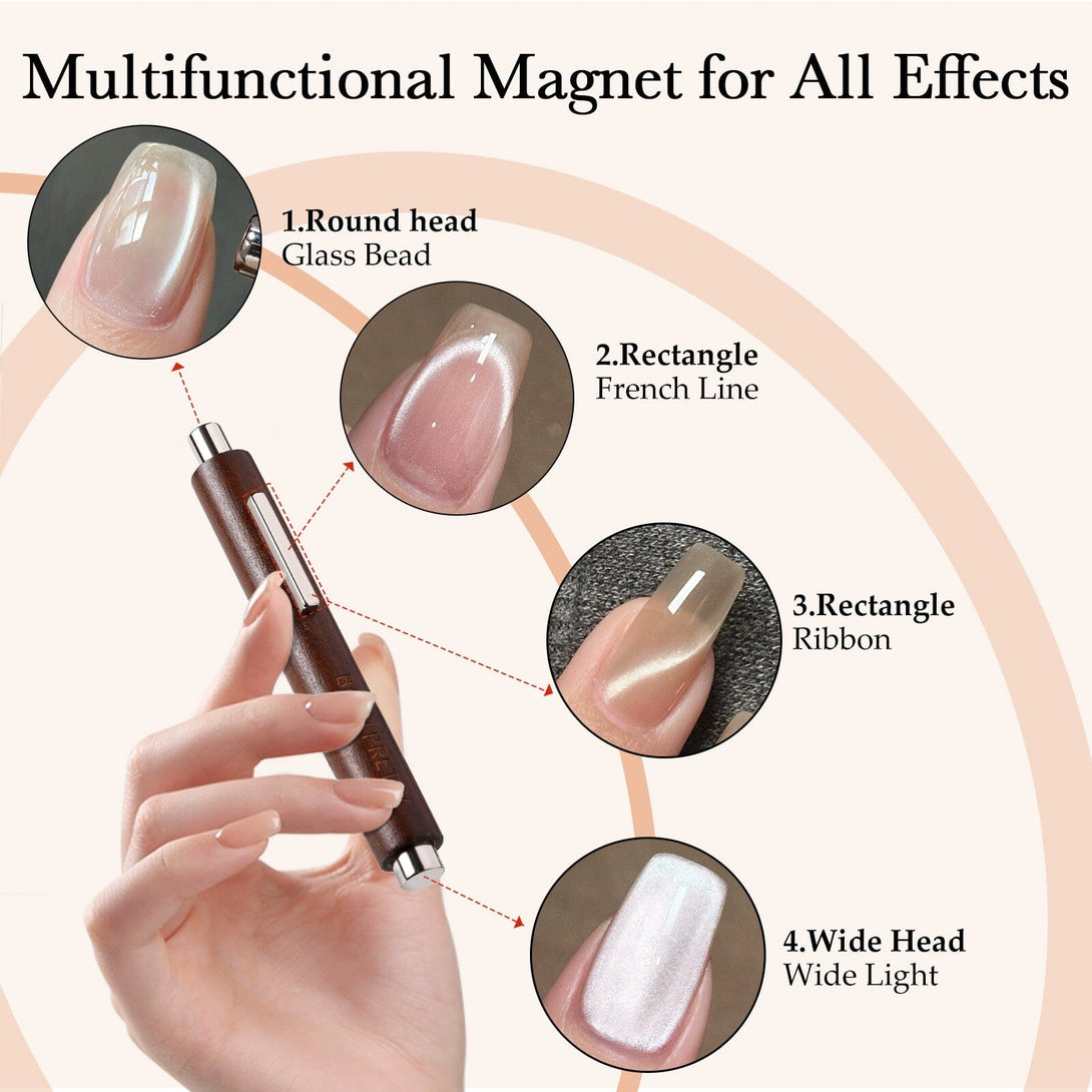 3-in-1 Magnet. Both ends of the magnet are cylindrical. It is a combination of a strong magnet and a weak magnet, which makes it more practical. It is a nail art accessory tool that can be used to create various cat-eye patterns.