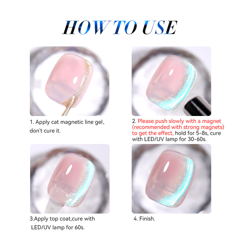 Step 2. Please push slowly with a magnet(recommended with strong magnets) to get the effect, hold for 5-8s, cure with LED/UV lamp for 30-60s.