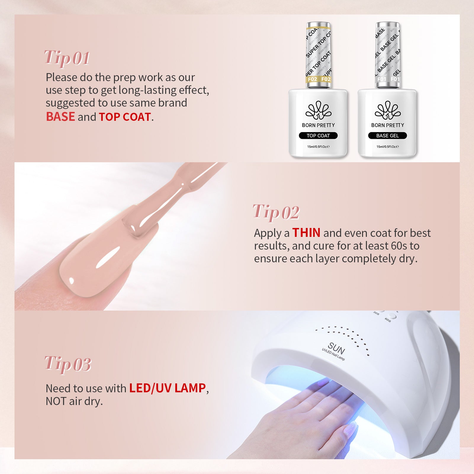 Step 3.Apply Base gel first,which can make polish lasting longer, cure with UV lamp or LED lamp. (Necessary).